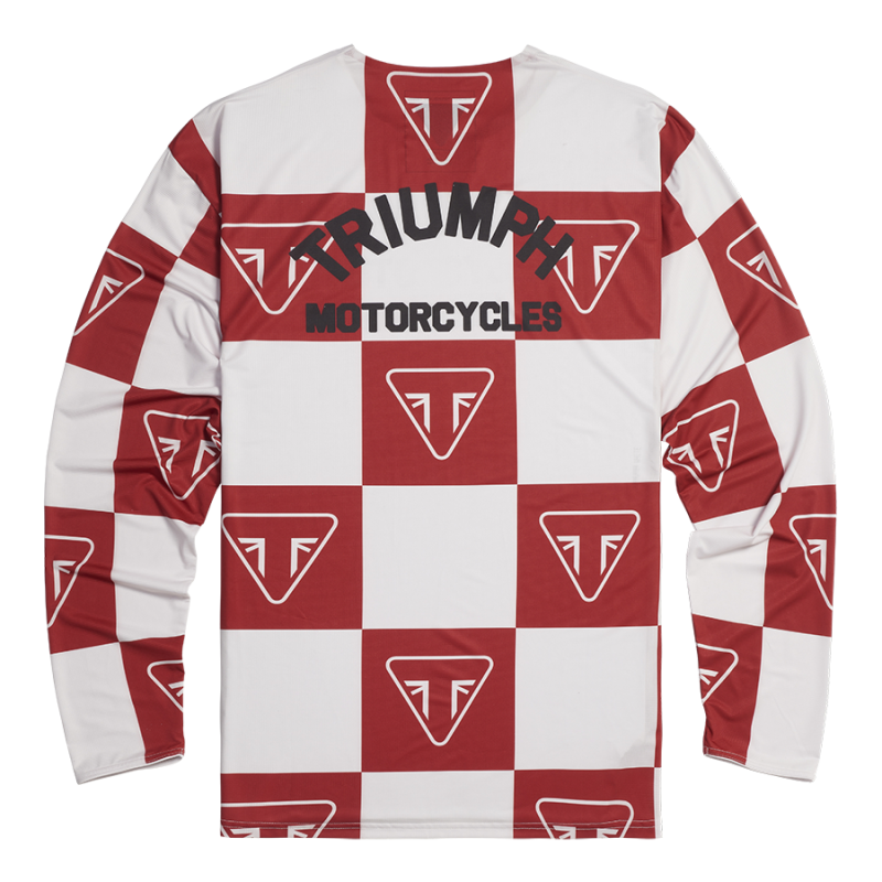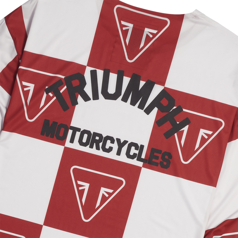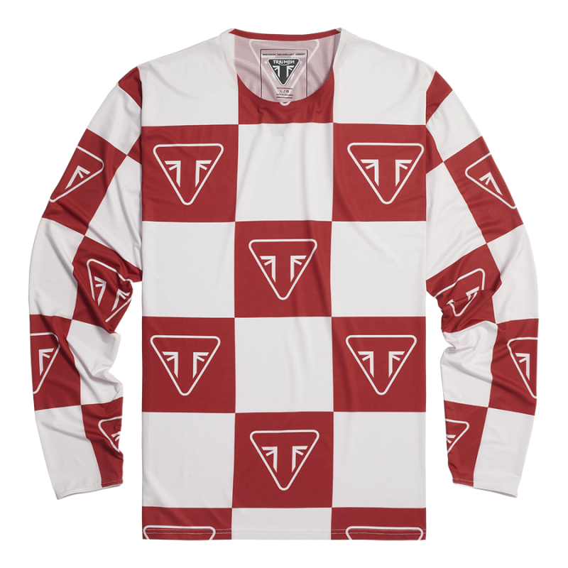 Featuring a checkerboard all-over print with Triumph badge logos diagonally placed. This item is larger than standard and can be worn over body armour if desired.