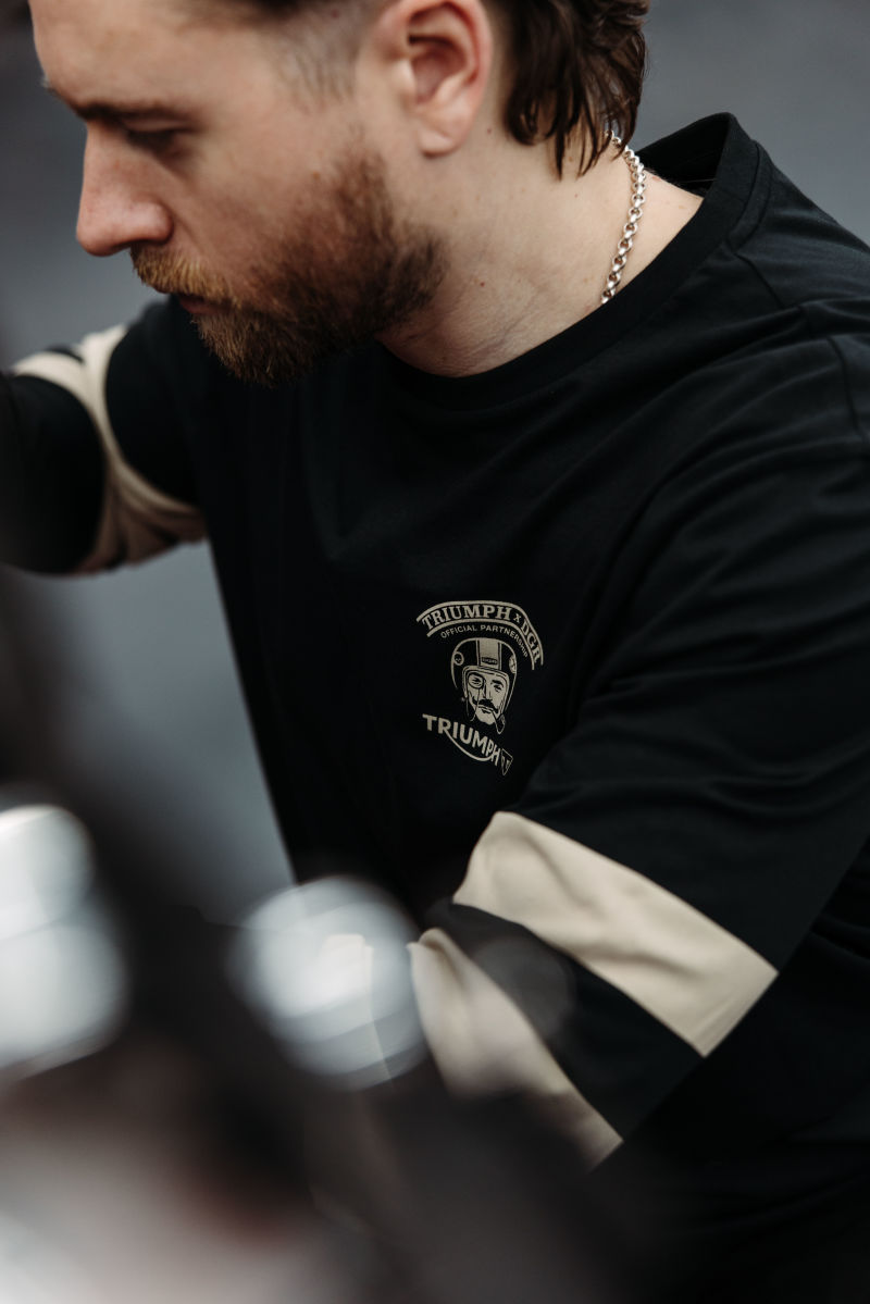 Drawing inspiration from our racing history, this classic fit tee features bold racing stripe sleeves and original and exclusive co-branded Triumph and Distinguished Gentleman's Ride 2025 design.