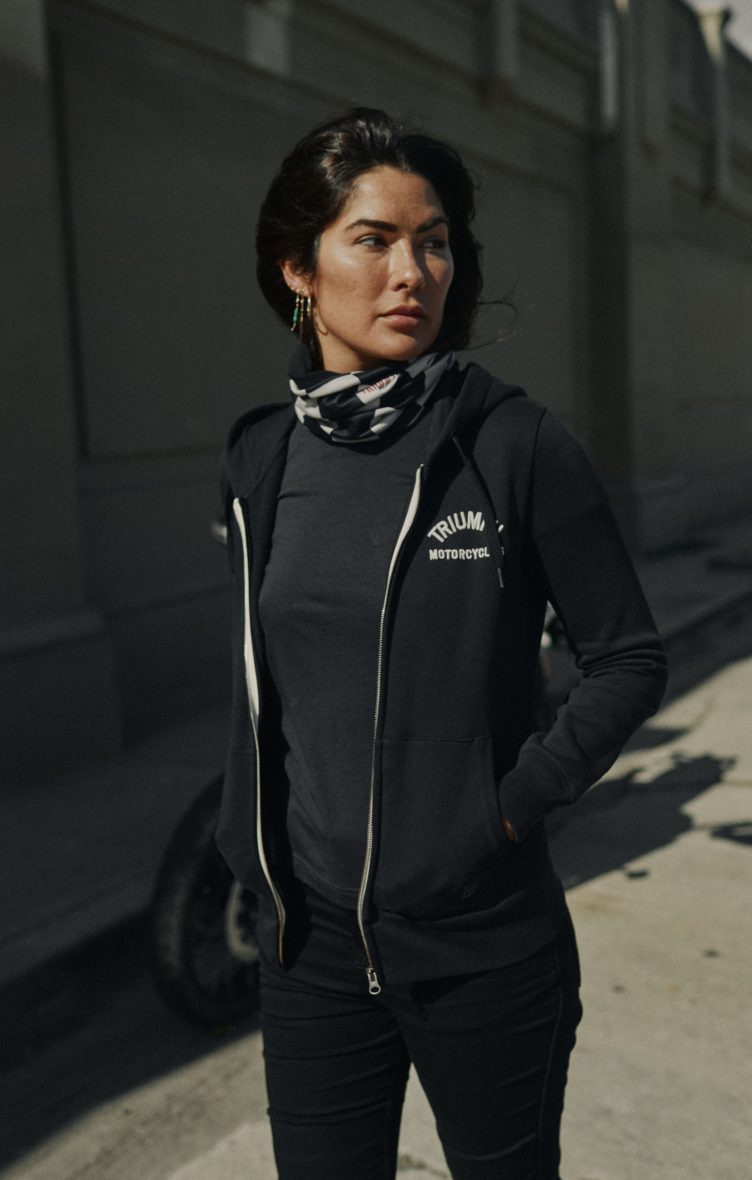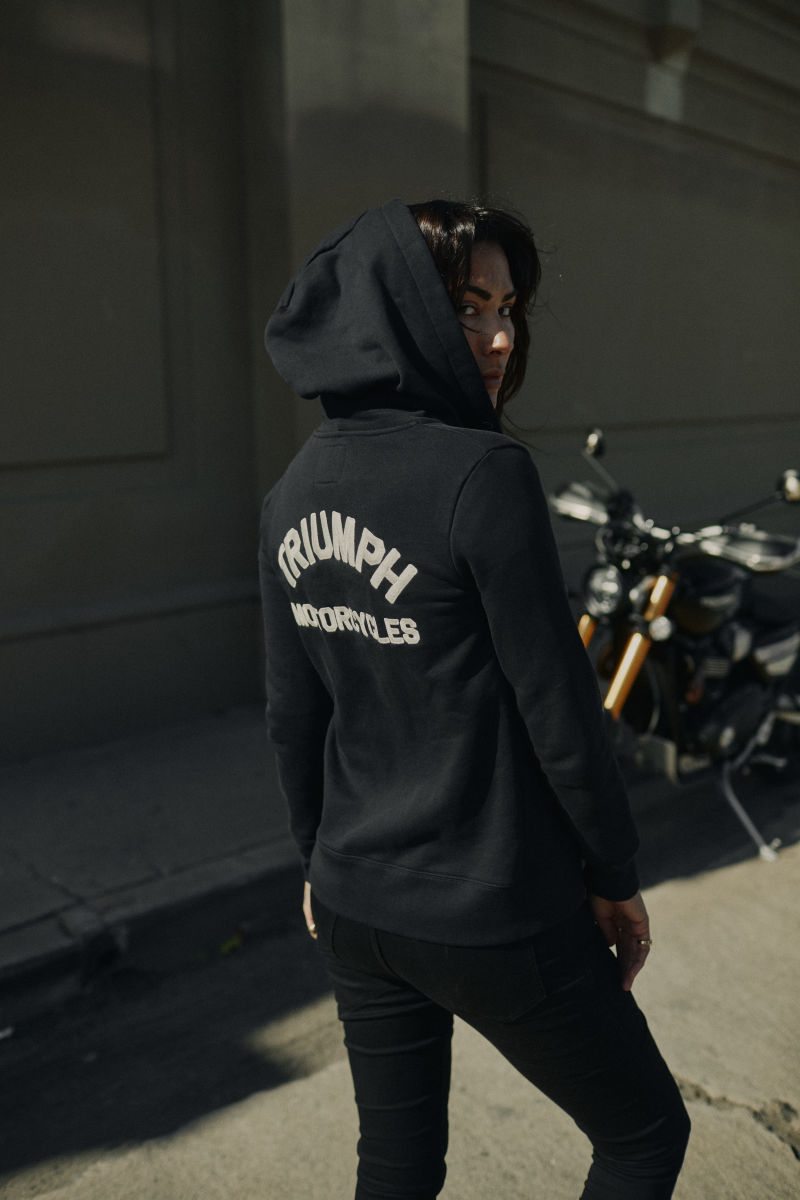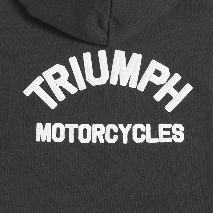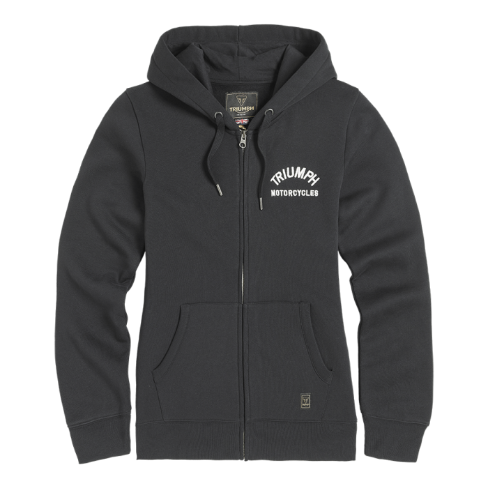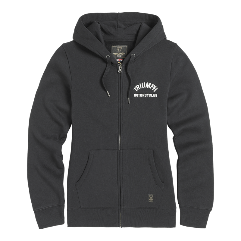 Women's heavyweight, fleece back cotton hoodie with arched Triumph Motorcycles embroidered lettering - small on the left chest and large across the back, full length front zip, double kangaroo pockets, and drawstring hood.UPS Shipping