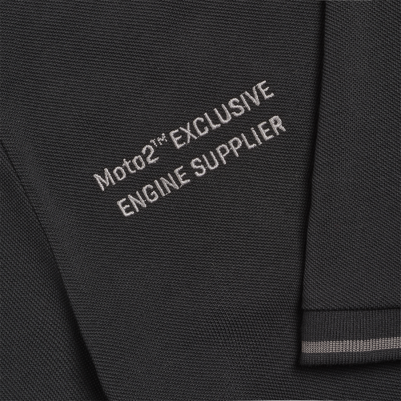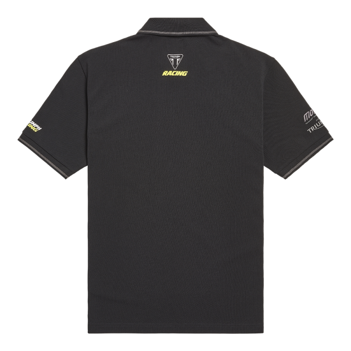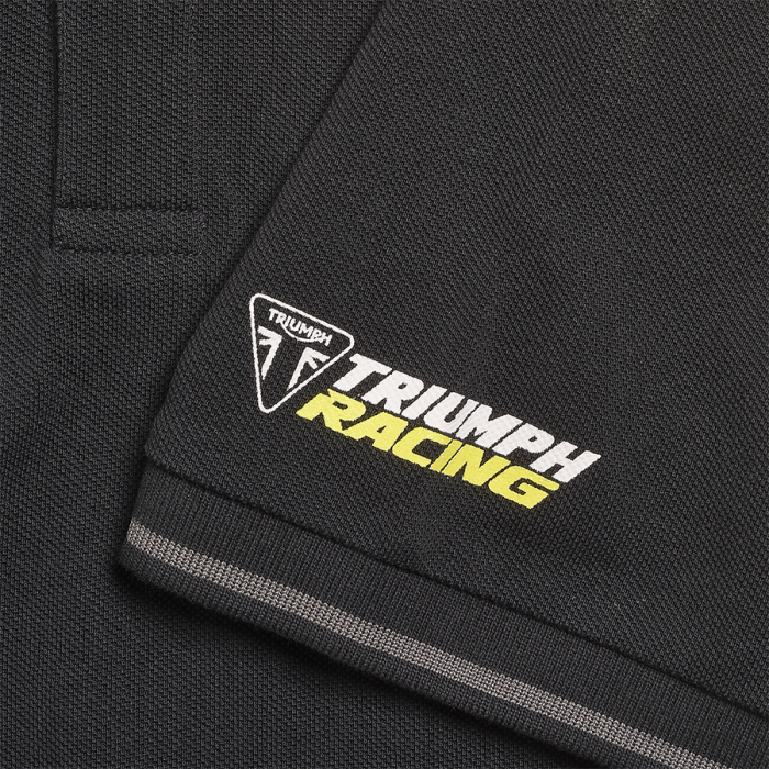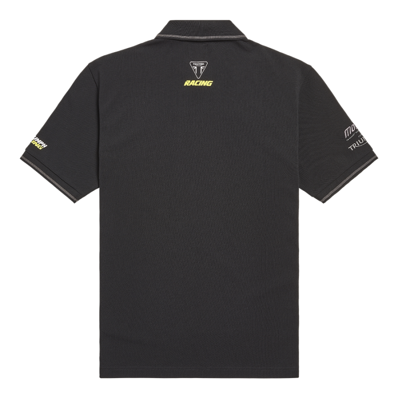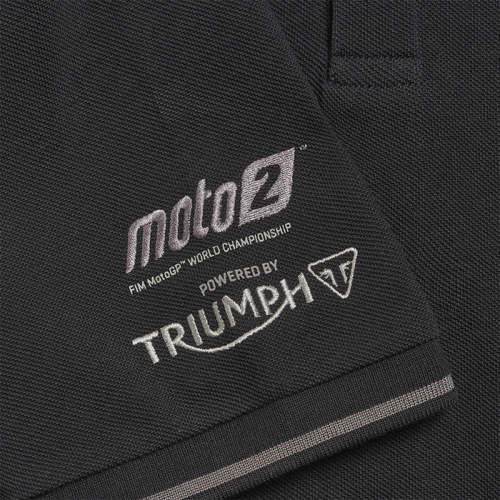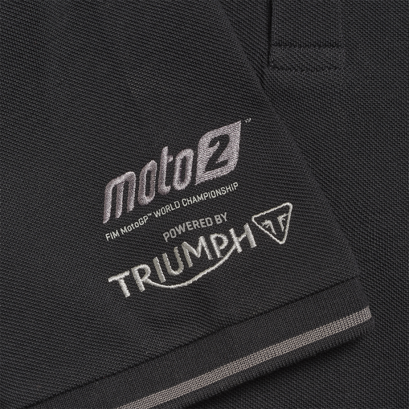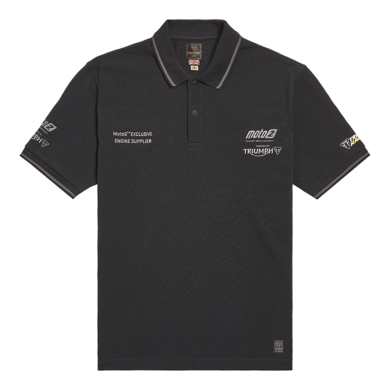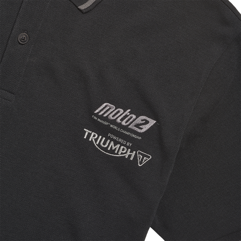 A classic 100% pique cotton polo shirt in Jet Black, featuring the official Triumph engine supplier logos to Moto2™UPS Shipping