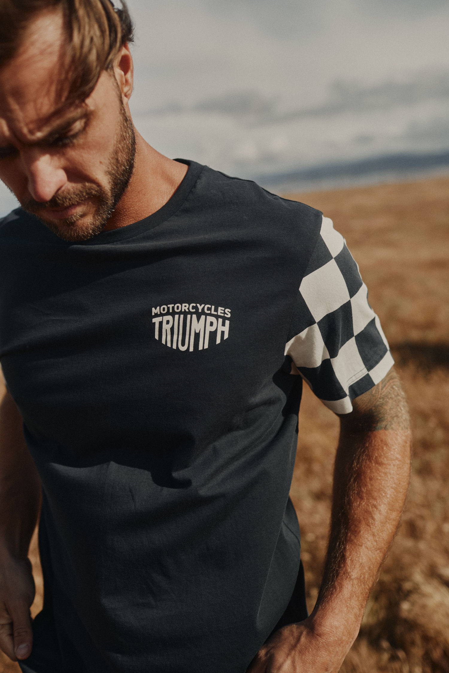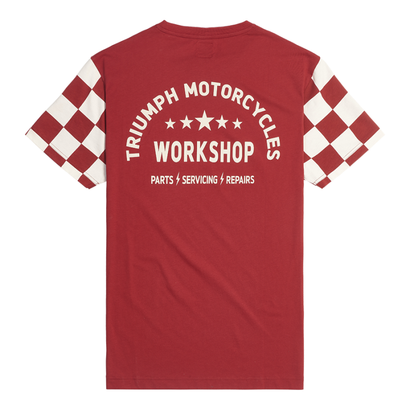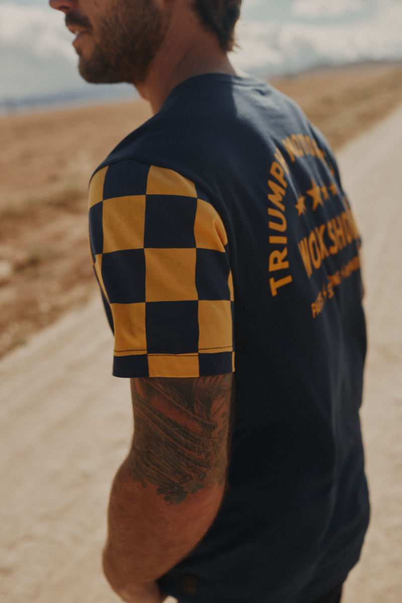 Classic fit tee featuring our Triumph Workshop Arched Graphic and bold checkerboard sleeves.