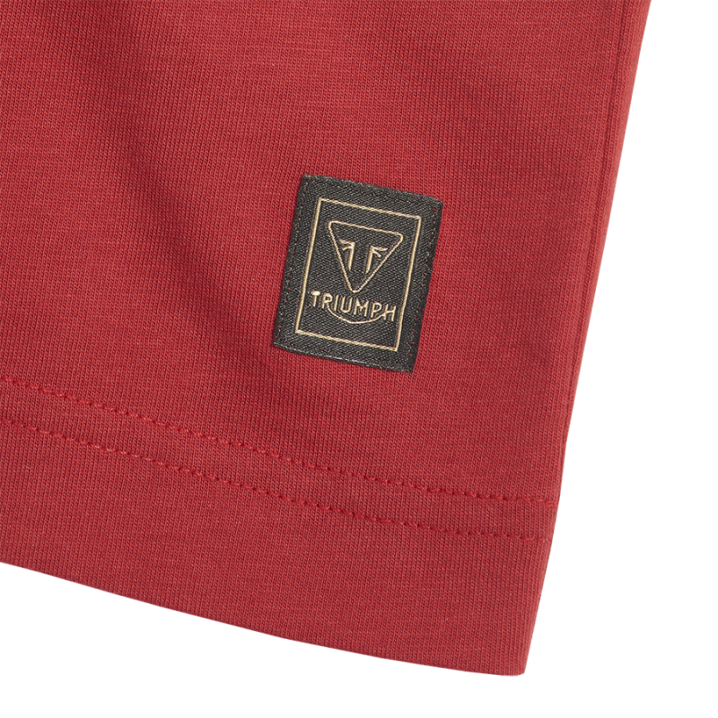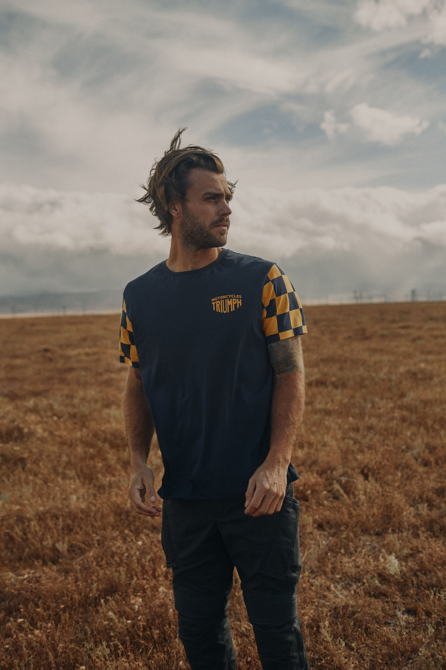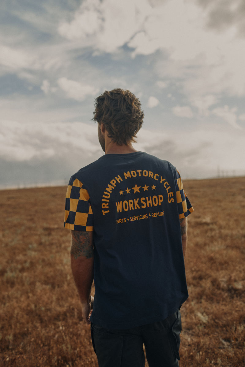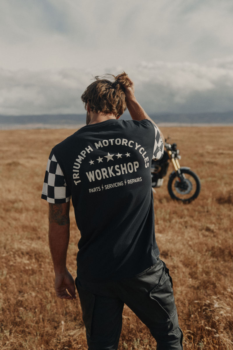 Classic fit tee featuring our Triumph Workshop Arched Graphic and bold checkerboard sleeves.