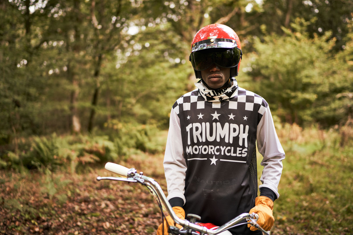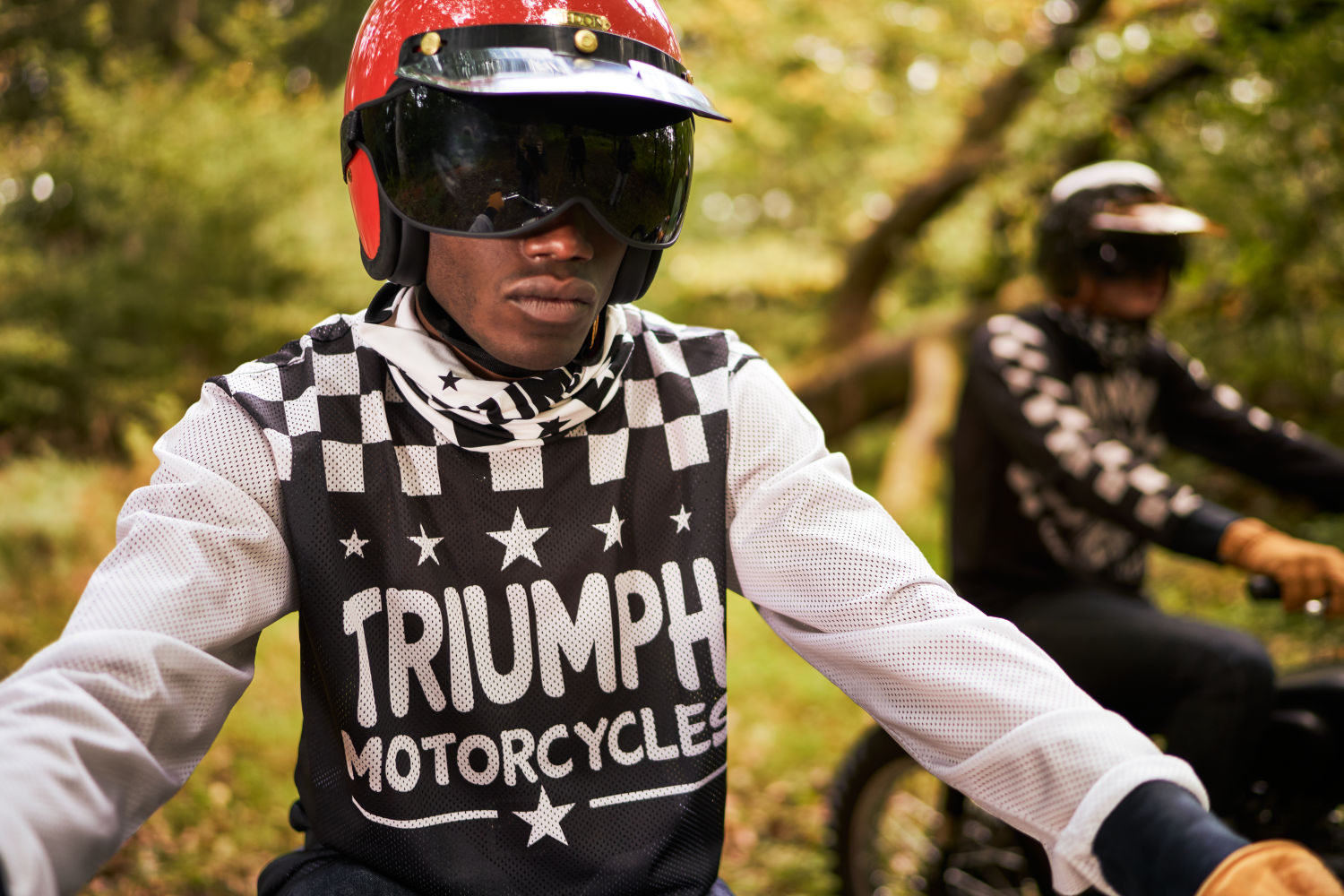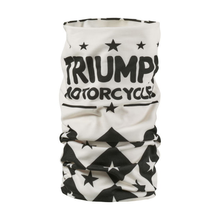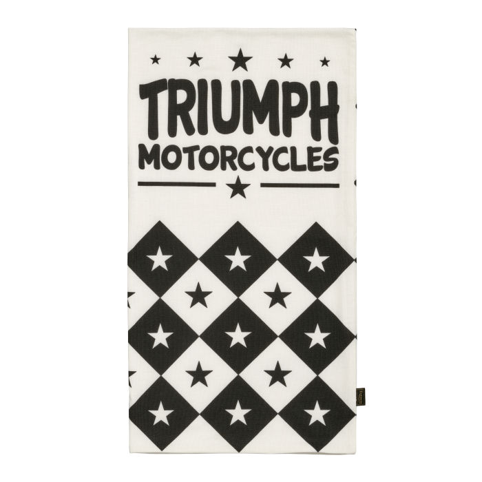Finished off with "Triumph Motorcycles" in a stylized text and racing stars checkerboard designs.